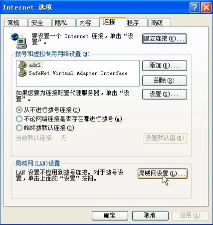 与第一种情形不同的是,此时从电脑ping路由器是通的,只是无法进入路由器设置页面。如若符合此描述,那么首先就应该检查一下浏览器的代理服务器设置,往往都是代理惹的祸:启动浏览器打开一个网页,选择工具菜单中的Internet选项- 连接选项卡右下方的局域网设置,禁用代理服务器功能: